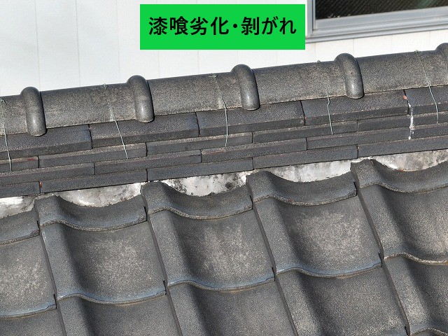 ✔ はがれた漆喰が屋根の上に多数残っている
