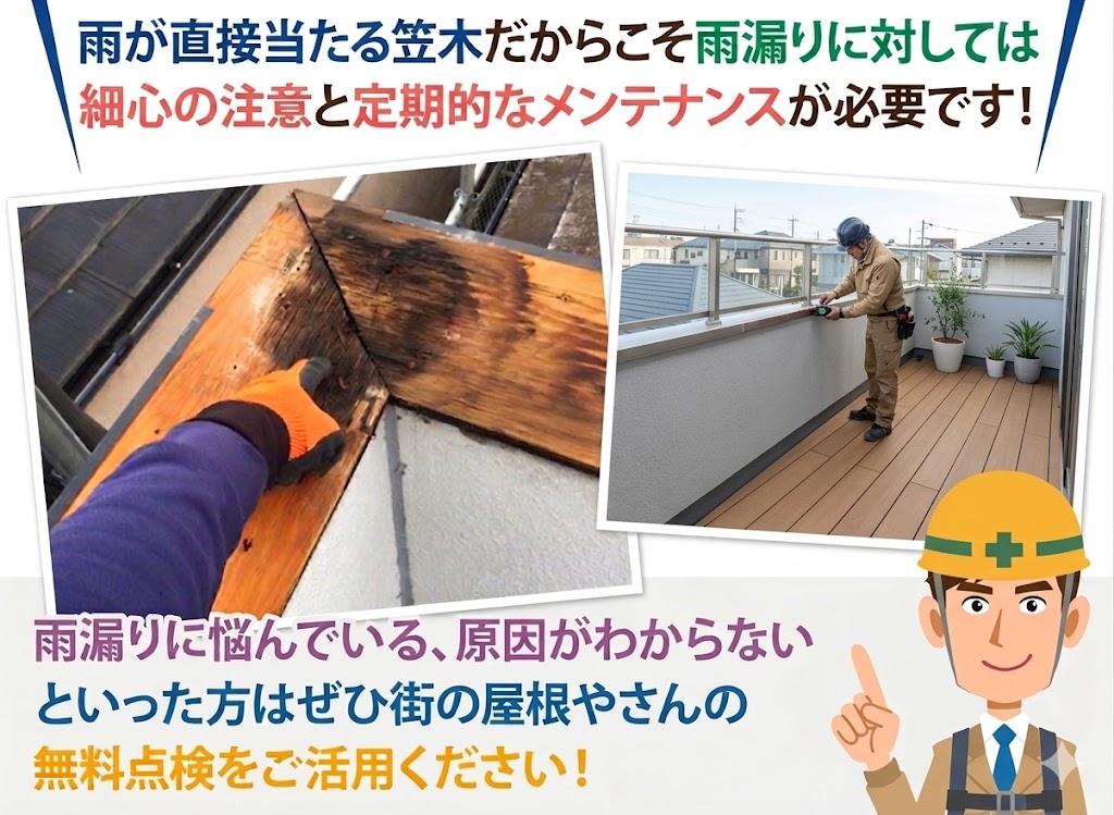 今回のように、ベランダや笠木部分など、見落としやすい箇所が原因となるケースも多くあります。