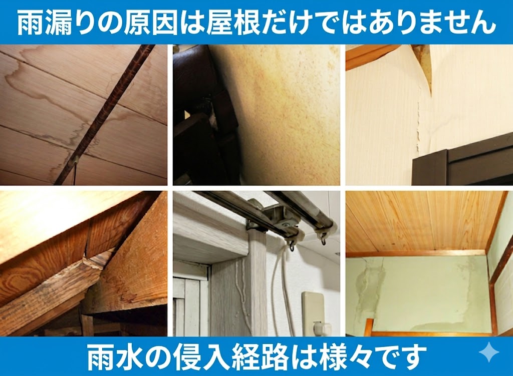 「雨漏り=屋根が原因」と思われる方が多いのですが、実は雨水の侵入経路はさまざまです。